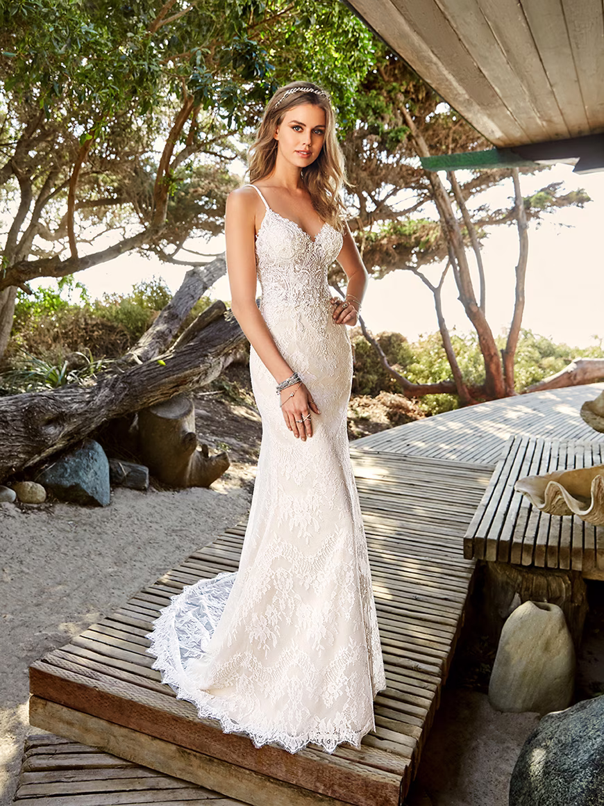 Our Simply Val Stefani collection of bridal gowns embrace that carefree, effortless spirit. From modern styles that are exquisitely detailed with many embellishments to unique Boho designs with a minimalist vibe, we offer a variety of gowns that’ll fit your personal style. Let’s look at four beach wedding dress ideas that work beautifully for seaside ceremonies and destination weddings.