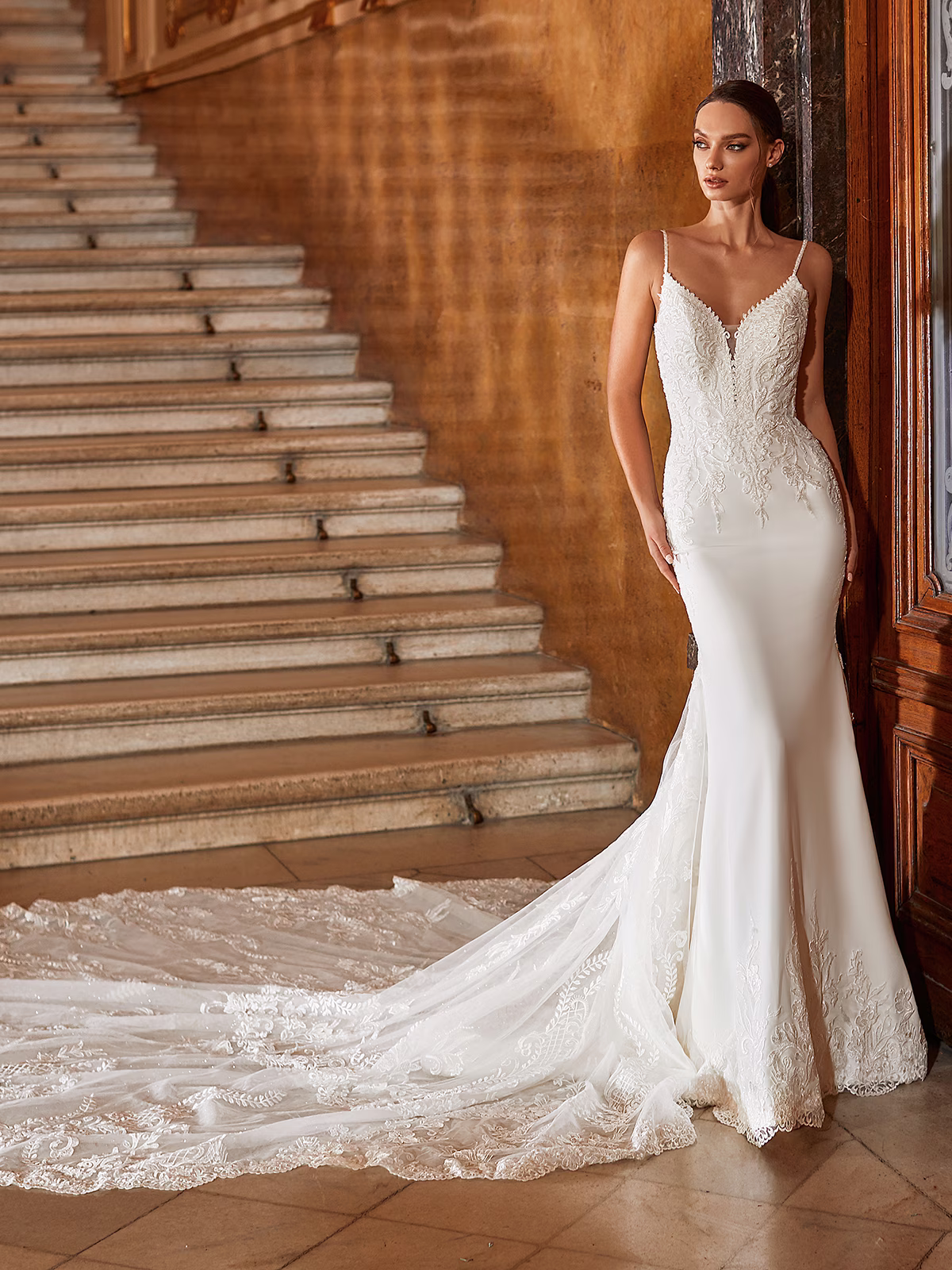 For the bride that wants to make a fashion statement with a luxurious slim fit gown, Style AIDA is sure to be a show stopper. This crepe mermaid wedding dress hugs every curve and includes carefully placed embellishments that make this design unforgettable. The fitted bodice is embroidered with vine leaf lace appliques and tonal beading that will shimmer under the lights. Featuring a deep v-neck, beaded spaghetti straps and a see-through sparkle tulle cathedral train, Style AIDA will have guests' heads turning in awe the entire evening.