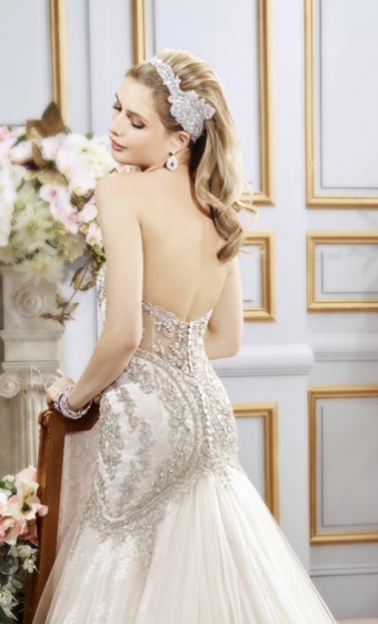 This phenomenal Val Stefani style is the absolute wedding gown for any bride who is looking for the perfect blend of decadent beading and elegant lace. The sweetheart neckline is adorned in silver embroidery and opulent beading allowing you to shine throughout your special day.To enhance a feminine silhouette, the asymmetric drop waist will accentuate your natural curves as you take your walk down the aisle. This mermaid gown features a sweetheart neckline that transitions into an exclusive low illusion open back featuring buttons and loops along the zipper. As if this gown didn't have everything you were looking for already, this wedding gown is available in a Taupe accenting color to compliment the Swarovski crystals. For the grand finale, the semi-cathedral train is embellished in Chantilly lace for a dignified and lavish look.