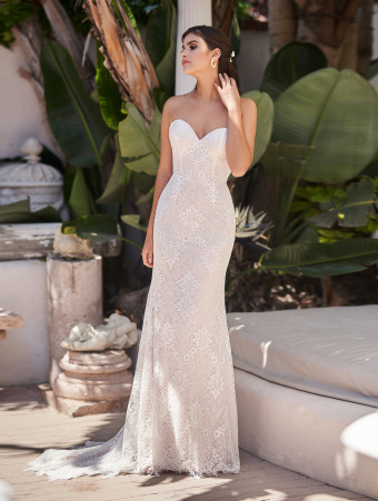 If you’re looking for more traditional details, Style Adira, a rustic lace gown with a mermaid silhouette, is the one for you. Crafted from a vintage-inspired re-embroidered lace, this gown runs smoothly against your curves while exuding chic style. The sleeveless look paired with a sweetheart neckline is perfect for the bride that wants to soak in the sun during the ceremony and then dance the night away.