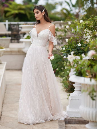 Make a charming statement in Style Madrid, a floral lace design that is crafted with crystals, rhinestones, and specialty beading. Romantic re-embroidered lace appliques accented with sequins replicate the flourishing flowers from the springtime season and are complemented throughout the gown, making you look like a garden goddess.