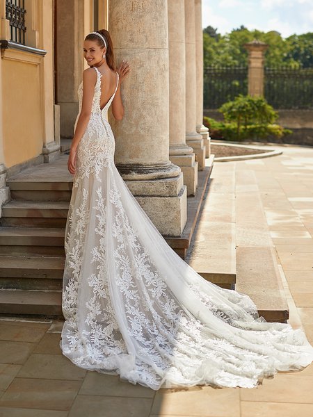 Set against the backdrop of a French château, a storybook romance springs to life the moment you step into the Tiffany, a deep V-neck lace mermaid wedding gown by Val Stefani. Heavily influenced by European fashion, this statuesque design makes a stylish impact from the lacy straps all the way to the wispy, sheer cathedral train. Architectural in structure, this streamlined gown is made to sculpt and enhance your physique. Dramatic, flowing lines on the neckline and beadwork on the skirt draw the eye up and down which elongates your body and enhances your curves. This bridal gown features an unlined bodice covered in embroidered lace appliqués that twinkle with hand-sewn beading and sequins. The beadwork gathers at a plunging neckline that includes an illusion inset. From behind, an open illusion back dips just below your shoulder blades and elegantly placed buttons call attention to the curve of your lower back. The satin stretch mermaid skirt fits snug around your hips before embroidered sparkle net material begins to float away at mid-thigh. The design is finished with a breathtaking cathedral train that will ensure all eyes are on you as you walk down the aisle. This style is available in your choice of three timeless colors: ivory, white, or as pictured in a combination of ivory, taupe, and rose.