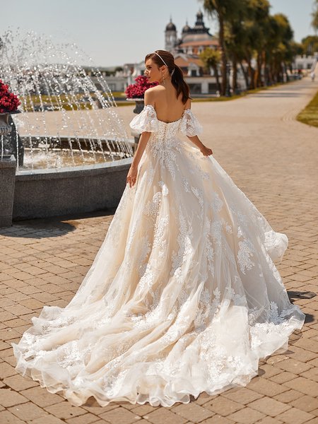 There’s another special, distinctive element to the Mariana wedding dress: the option to attach off-the-shoulder sleeves. Crafted from sheer tulle, the sleeves completely transform the upper portion of this design. They’re lightweight and airy, and they tie into delicate bows, draping down each arm in the most effortless and ethereal way. Brides can attach them for their ceremony, remove them for their reception, or wear them all day, as the dress is equally as stunning with the sleeves as it is without. To try on the Mariana wedding gown, schedule a fitting with an authorized Val Stefani retailer near you.