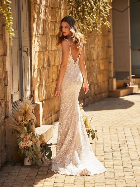 A deep V-neck, in addition to an unlined bodice, will show just a bit of skin while simple spaghetti straps ensure everything stays in place. As the lacy pattern extends from the bodice of the gown to the train, it features more floral details, giving you the appearance of having just stepped out of the garden. Satin buttons and a deep V-back complete the look of this mermaid style bridal gown, ensuring that everyone in attendance at your wedding is mesmerized when they see you approaching. Think this design may be the one? Find the nearest authorized Val Stefani retailer to try on the Atlas.