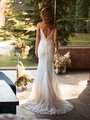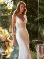 The lacy details hug your hips while leafy band embellishments accentuate your natural waistline and bust. The beautiful embroidery is done to create a rustic 3D effect and gives the entire dress a Grecian goddess feel. Guests will be mesmerized by the sparkly layer of sequins that adds surprising detail under the geometric lace. The dainty spaghetti straps lead to an open back that is also V-shaped. Pictured in Ivory, this gown is just as gorgeous when worn in an Italian villa as it is at a no-fuss farm wedding.
