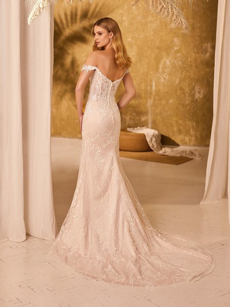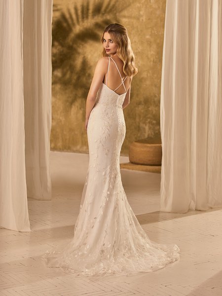 A little bit boho and a little bit rock and roll, the Lotus style S2213 from Simply Val Stefani embodies a breezy spirit that carefree brides will adore. Covered in allover cotton lace, this dress is fuss-free without compromising on stunning details. It is named for the figure-flattering lace that features stylized lotus flowers, leaves, and vines that curve around your hips and bust, trailing all the way down to the chapel train that is finished with feathery hem lace trim. Beads are used sparingly on the Lotus gown, but where and how they are used will cause guests to do a double take as you’re walking down the aisle or two-stepping on the dance floor. The deep sweetheart neckline is lined with glass beads and sequins, as are the spaghetti straps on the front and back of the dress. Beads also float above the seam at your natural waist, cinching you in and providing the gown with a dainty belted detail without the bulk. Pictured in Ivory with Taupe lining, this gown is also available in all Ivory. It looks stunning whether you wear this gown with a leather jacket at a chapel in Las Vegas or you weave a flower crown into your hair at a desert wedding.