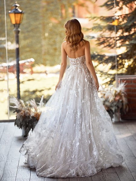 Strappy back detailing adds a modern edge to the classic styling of our Simply Val Stefani Sirena wedding dress style S2270. Simply stunning in layers of floral embroidered net and sheer net, this princess-inspired gown boasts a fairytale look that exudes elegance and romance from top to bottom. The fitted bodice is unlined and features a square neckline with an illusion inset in the center. We’ve detailed the bodice with slender straps adorned with glass beads, bugle beads, seed beads, and sequins. In back, two rows of straps angle towards the center to create a chic V-shape. The bodice is finished with illusion side insets and a center back zipper with covered buttons that end at the natural waist. At the waist, the skirt floats and falls around the body in a classic A-line shape that flatters every body type. Lined with soft stretch fabric, the skirt culminates in a sweep train with thin horsehair trim at the hem that creates a slightly wavy effect. The entire top layer of the gown is made from floral embroidered tulle, making the Sirena a floral fantasy for the modern bride that wants a classically romantic look. Sirena is available in ivory with a solid ivory under layer as well as ivory/latte/nude color combination with an under layer of nude net.