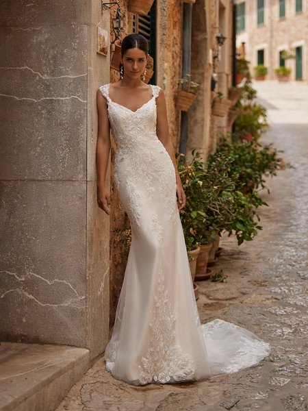 The Solana style wedding gown is gorgeous for its perfectly crafted fit, richly textured fabric, and distinctive design details. The beads and sequins allow this look to shimmer and shine, so from your walk down the aisle to your getaway at the end of the reception, you’ll glisten like a star throughout every moment of your big day. And because all-day comfort is key on your wedding day, we’ve added a soft stretch lining underneath. Schedule a fitting for the Solana wedding dress at an authorized Val Stefani retailer near you.