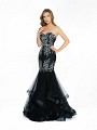 Val Stefani’s style 3775RI is a dazzling take on a classic mermaid prom dress. This dress will get the crowd talking with its flashy, fun and flirty design. This strapless dress has a sweetheart neckline that follows an open back that just oozes delightfulness. The tulle cascades adds to the texture of this floor length dress. It beautifully cascades down and is finished off with horse hair trim hem for that exciting and unique touch. Moreover, the striking beaded bodice is adorned with various delicate rhinestones, pearls, gems, bugle and seed beads with sequins to give that astonishing finish. This dress comes in vivid colors of Black and Red partnered with Silvery accents for a spectacular and upbeat style.